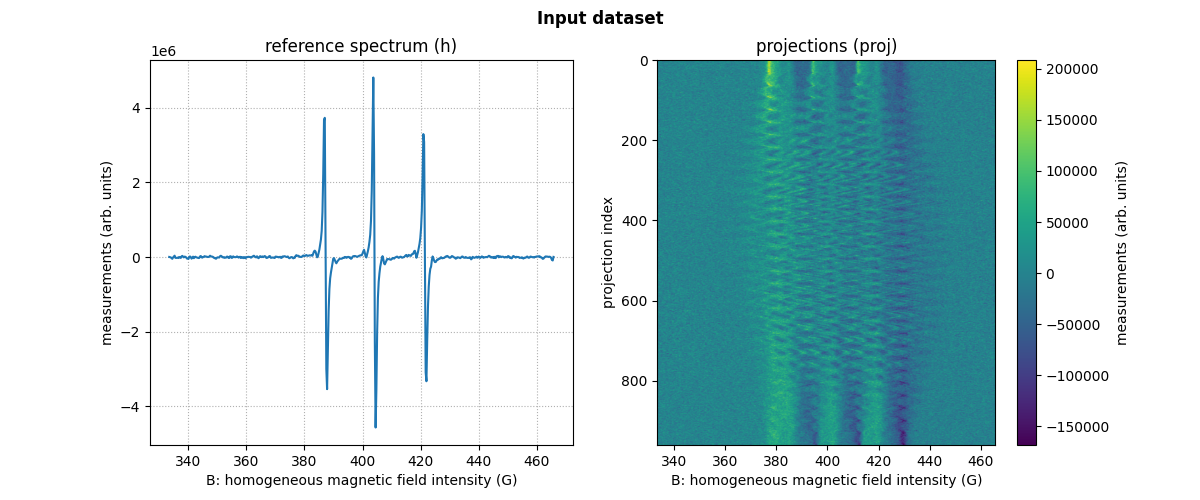 B: a one-dimensional array containing the values of the homogeneous magnetic field intensity used for sampling both the reference spectrumhand the measured projectionsproj(the reference spectrum and the projections are assumed to be sampled over the same grid).